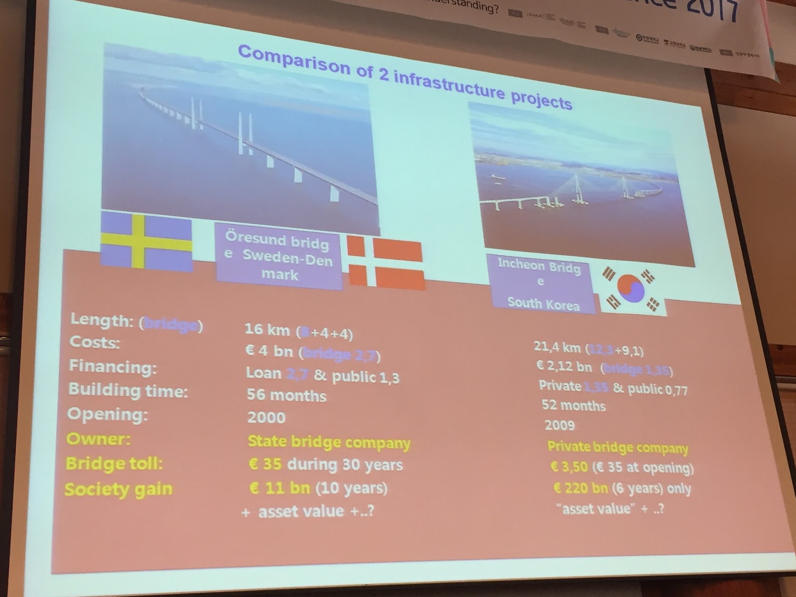 Ég tók að gamni ljósmynd af einni glærunni sem sýnd var á kynningu um þetta verkefni. Hér má sjá samanburð á Incheon brúnni (21 km) og Eyrarsundsbrúnni milli Danmerkur og Svíþjóðar (16 km). Samanburðurinn er kannski ekki að öllu leyti sanngjarn en hann er áhugaverður. Byggingartíminn var sambærilegur, kostnaðurinn við Incheon var 50% af kostnaði við Eyrarsundbrúnna, brúartollurinn er 3,5 evrur á Incheon brúnni en 35 evrur á Eyrarsundbrúnni. Áætlaður fjárhagslegur samfélagslegur ávinningur af Incheon brúnni á 6 árum er 220 milljarðar evra, en sambærileg tala fyrir Eyrarsundsbrúnna er 11 milljarðar evra á 10 árum. Frumkvöðullinn tjáði mér að brúartollurinn mun falla niður í náinni framtíð. Fjárfestar fá ásættanlega ávöxtun á fjármagn sitt í gegnum þátttöku í hinni gríðarlegu uppbyggingu Yeongjong eyju, og öðrum svæðum sem hafa blómstrað eftir að brúin var tekin í notkun.